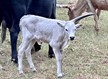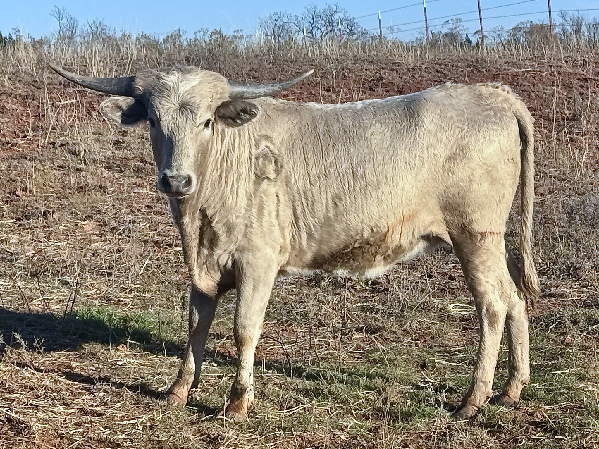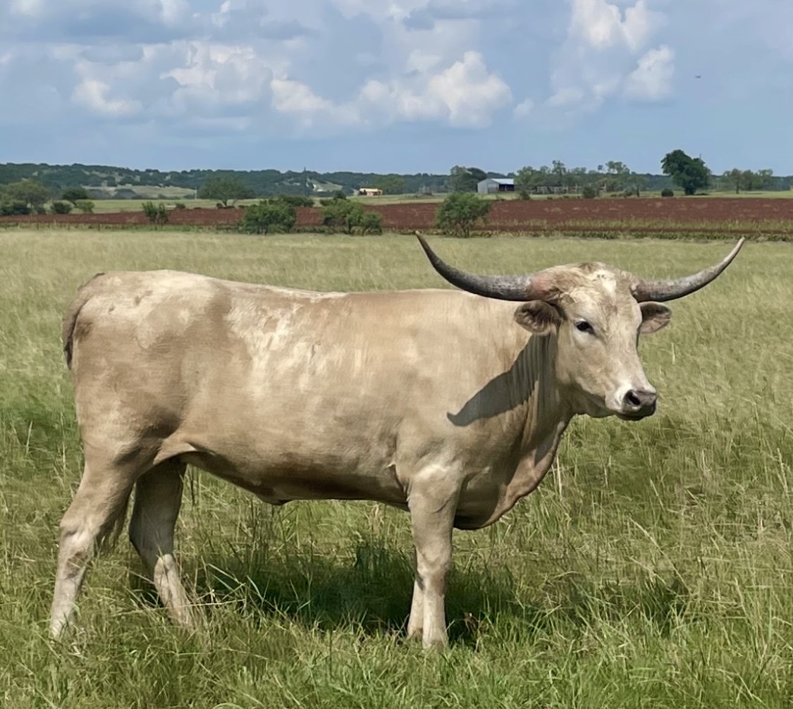Her pedigree is as golden as her spectacular glowing leather she's wearing. I didn't put glowing in there by accident...it actually glows out in the field. She is built long and thick with her horns now hinting of a possible roll. She should be bred to Goose and we can't wait to see what this sweet acting heifer throws with him.