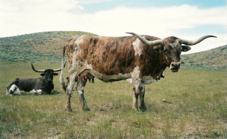 Great producing cow with flat twisty horns.Mother of Blue Caliber owned by Bill and Judy Meridith.