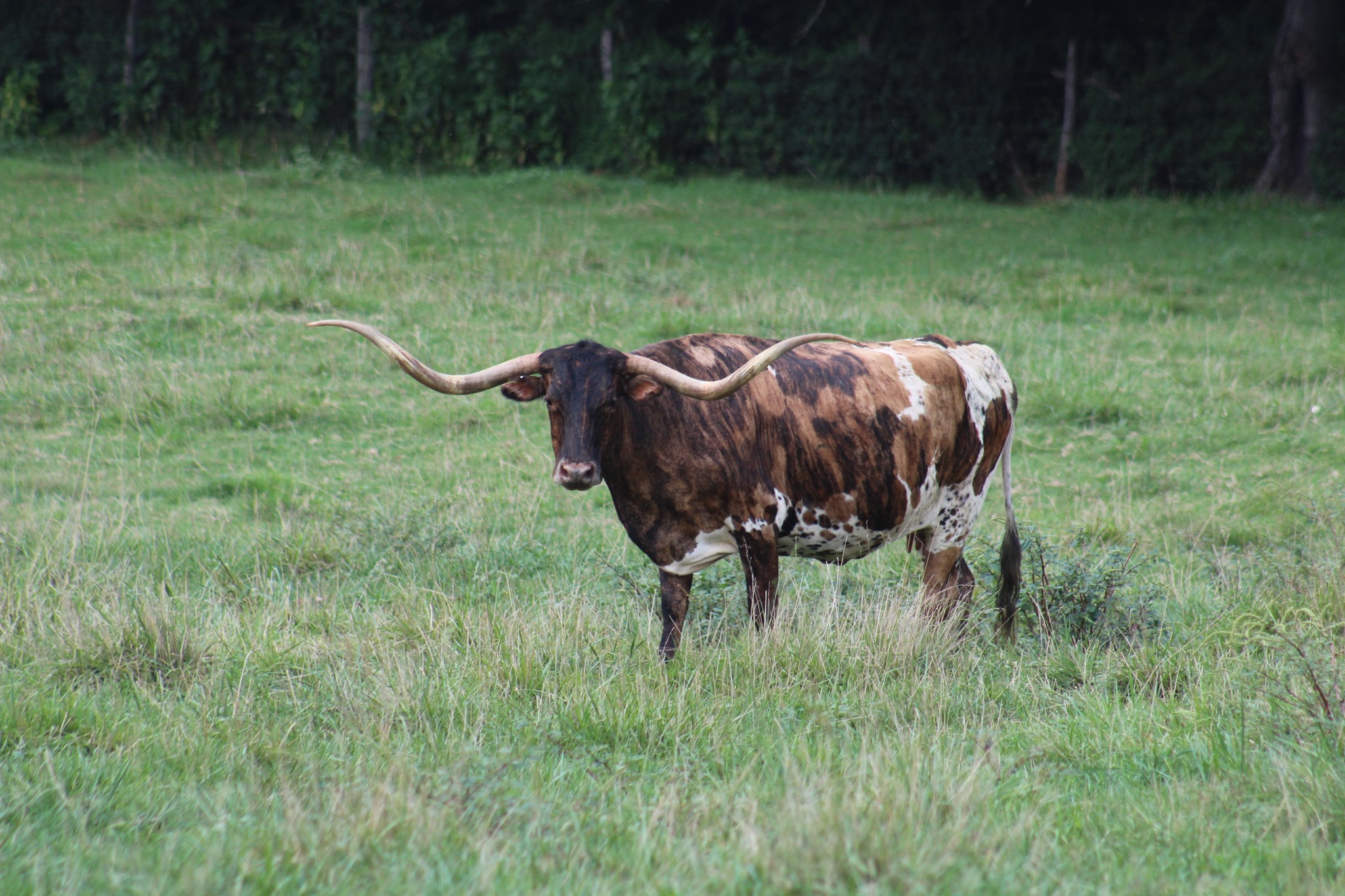 Spicette is a sweet mature cow that we were very excited to purchase. She has a beautiful tri-color with rolling twisty horns.
