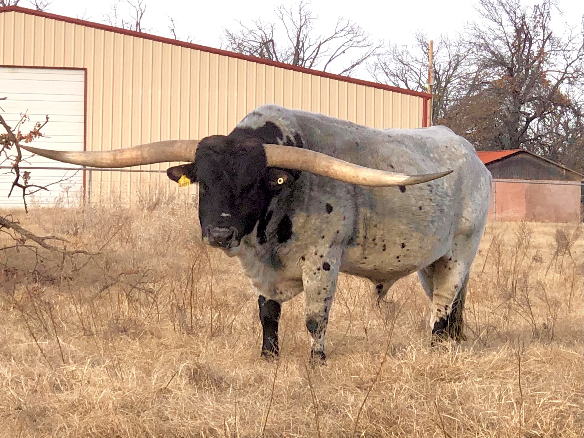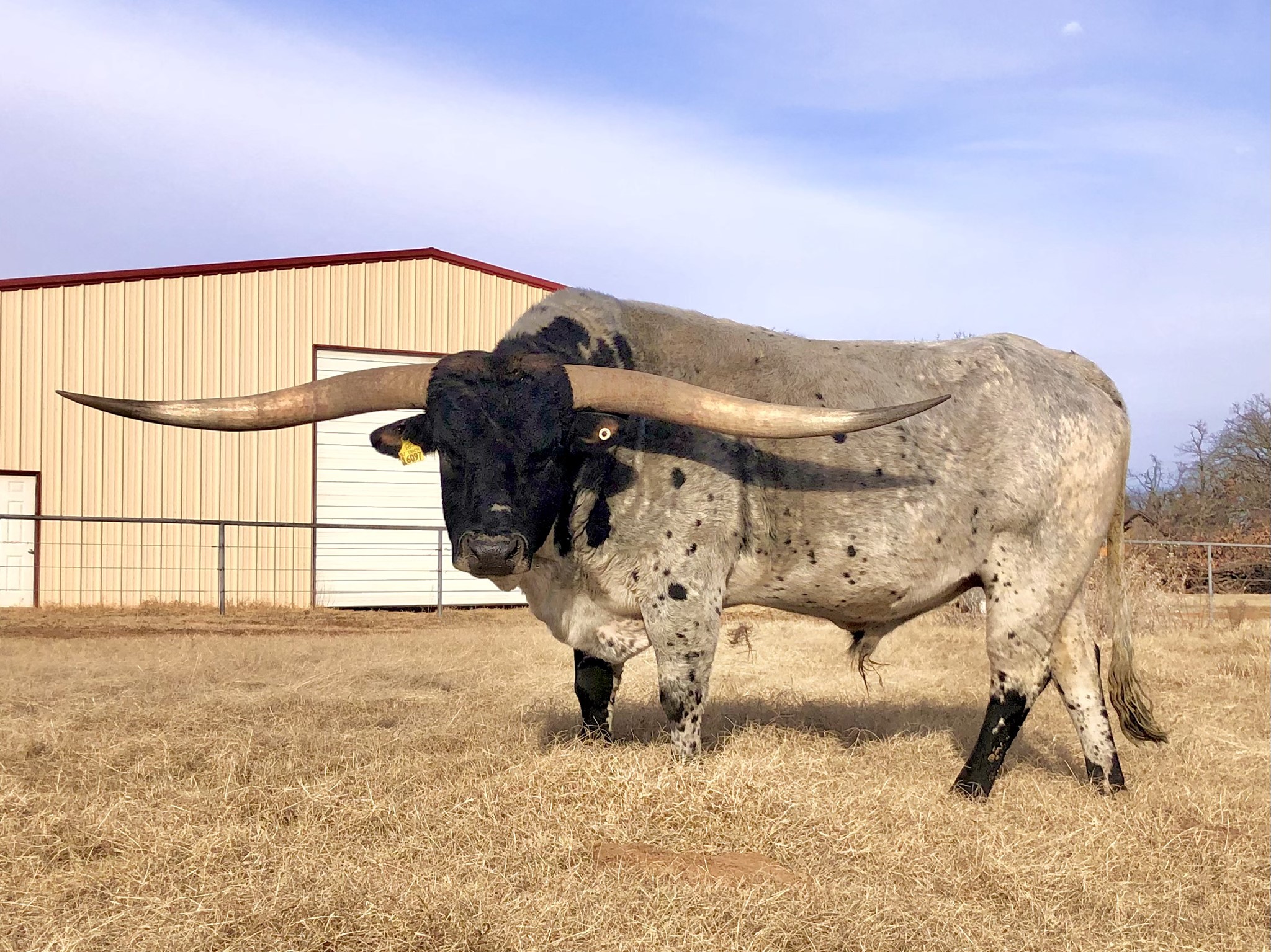 Rocket Man measured 90 1/2 inches tip to tip on 1/2/23. He won his class at the 2018 HSC with 84.5625 TTT at just 3 1/2 years old. He is truly an extraordinary bull that has even exceeded his sire, PCC Rim Rock. If you want to add size, Rocket Man 10 will do just that. He is a tall, stout, full bodied bull that has some of the flattest, lateral horns you can find. Known to lay down high horns on his progeny, Rocket Man 10 is the total package. Conventional straws are available at Champion Genetics and also REI in Stillwater, OK. Contact Cale at 580-461-2914 for any questions or additional info.
